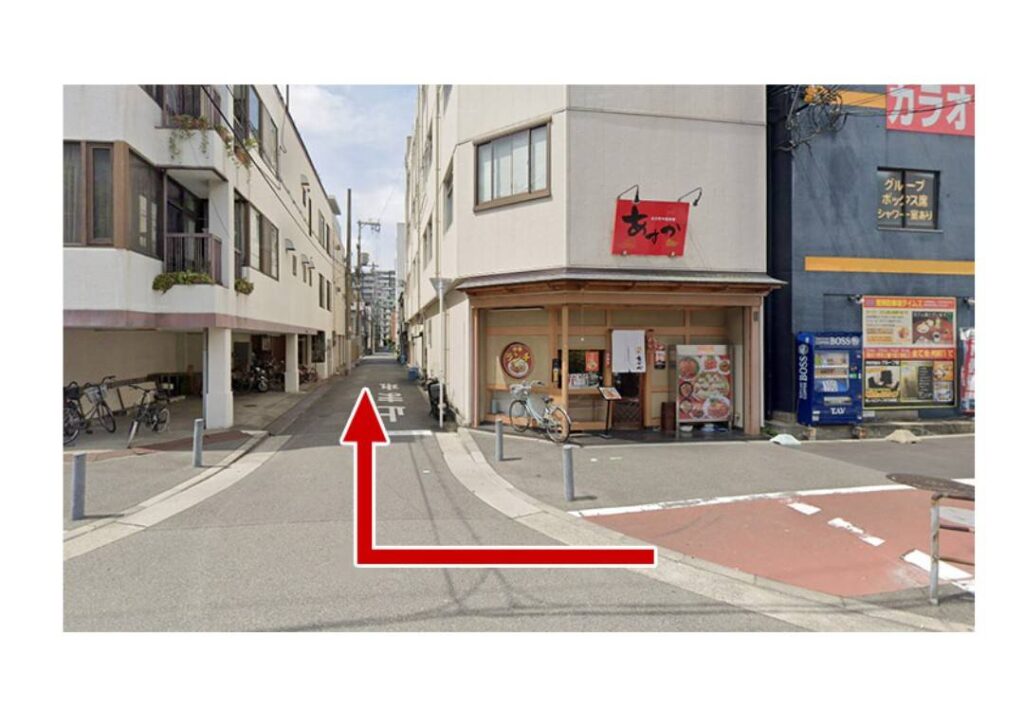 渡って直ぐの左側の角の「あすか」中華料理店の角を右側に曲がります。