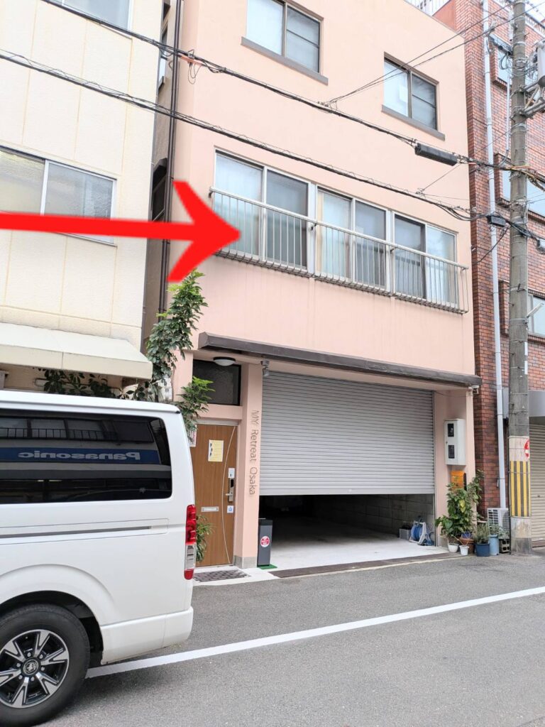 曲がった角から2軒目の薄いピンクの建物がお宿です。