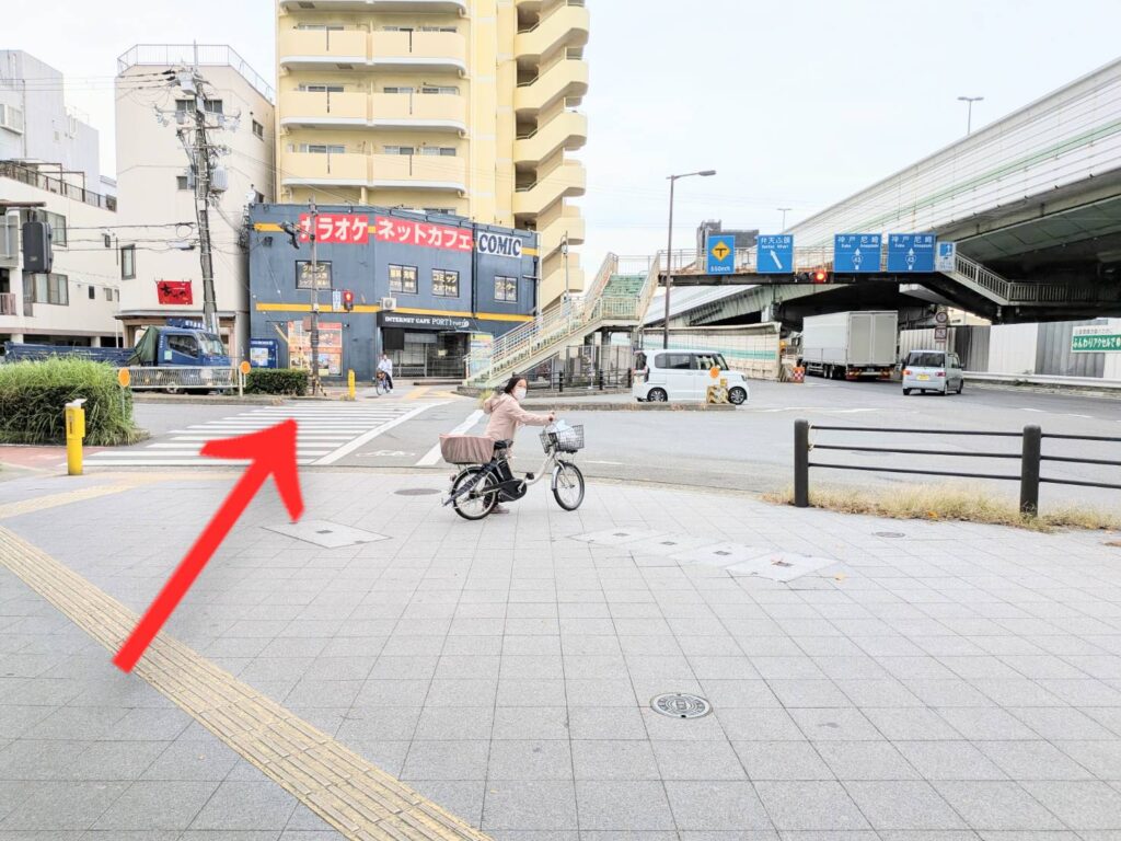道なりの角の信号を渡ります。